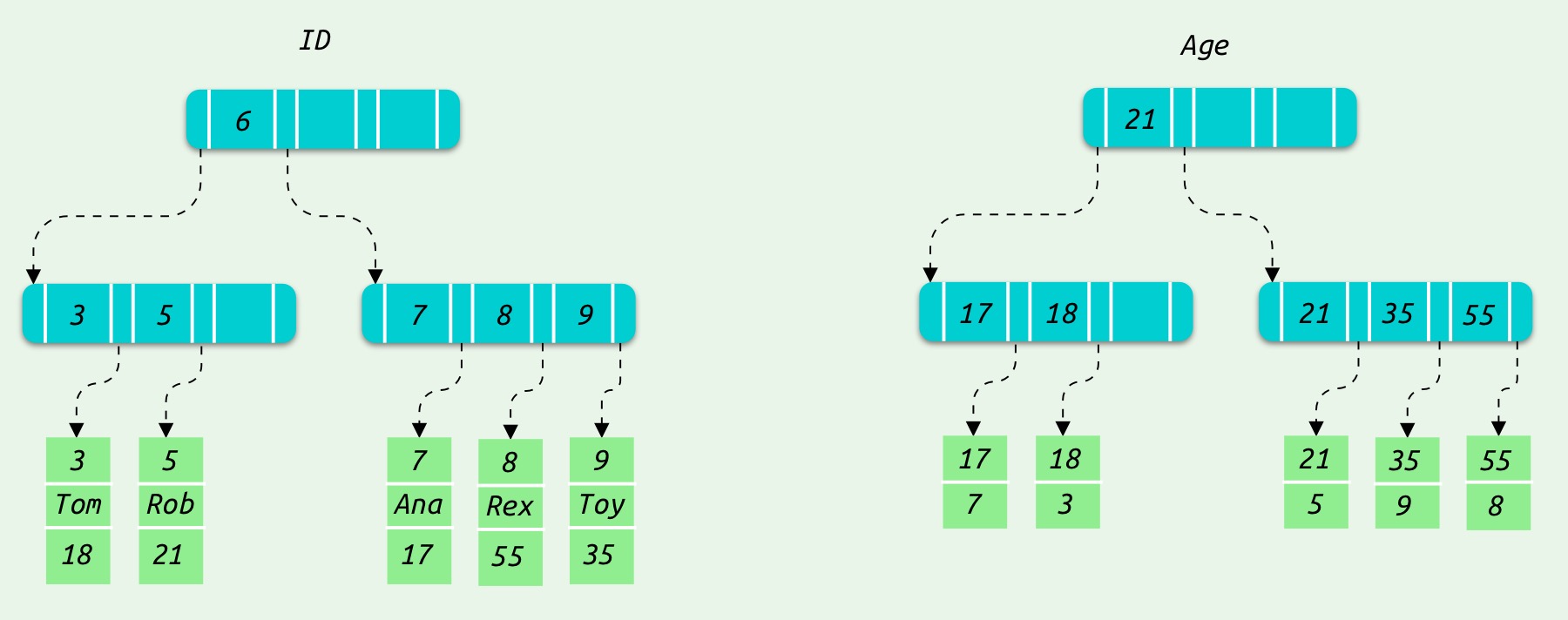MySQL 会分别创建主键id的聚簇索引和age的二级索引: